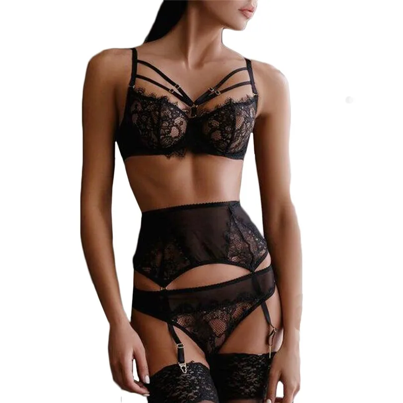 Related Product for Women Lace strap 3 piece set underwear set Sexy Lace Underwire Bra Sleepwear Bandage Black Lingerie